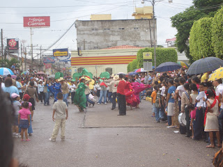 September is a crazy month in terms of holidays in Honduras, which is why I haven't posted in awhile. The good news is that now I have some pictures to share. Last week, Honduras celebrated children's day with a half day for elementary students. My students and I had a party in our classroom. It was pretty crazy with food thrown everywhere, a few games, and dancing, the favorite pasttime here. Then later that week Juticalpa celebrated Honduras' independence day with 3 parades (one for preschool and kindergarten, one for elementary, and one for high school). These parades are a huge deal....most of the town came out on Friday for the elementary school one and Saturday morning for the high school one. I had to march with my 5th graders in the parade. Above is a picture of some of my students holding the school sign. Street vendors were everywhere, selling drinks, chips, limes covered with chile powder (which I have yet to try), etc. I bought a huge baleada, the national food here, which is a giant flour tortilla usually stuffed with beans, sour cream, cheese, eggs, chorizo, and avocado. Since it rained for the 1st half of our parade, it was a good distraction. At the high school parade on Saturday, they had floats, bands, and more elaborate costumes. I felt dizzy during most of that so I spent most of the time sitting down on the sidewalk watching. Also, sometime last week, I got stung by a bee for no reason and the stinger was left in my elbow and my friend had to pull it out. The other reason why I'm suddenly really busy is that on top of upcoming progress reports, I found out I can take the GRE's in Tegus and will be taking them in a month so I'm studying like crazy. That's about it for now. Send me news from the U.S.!